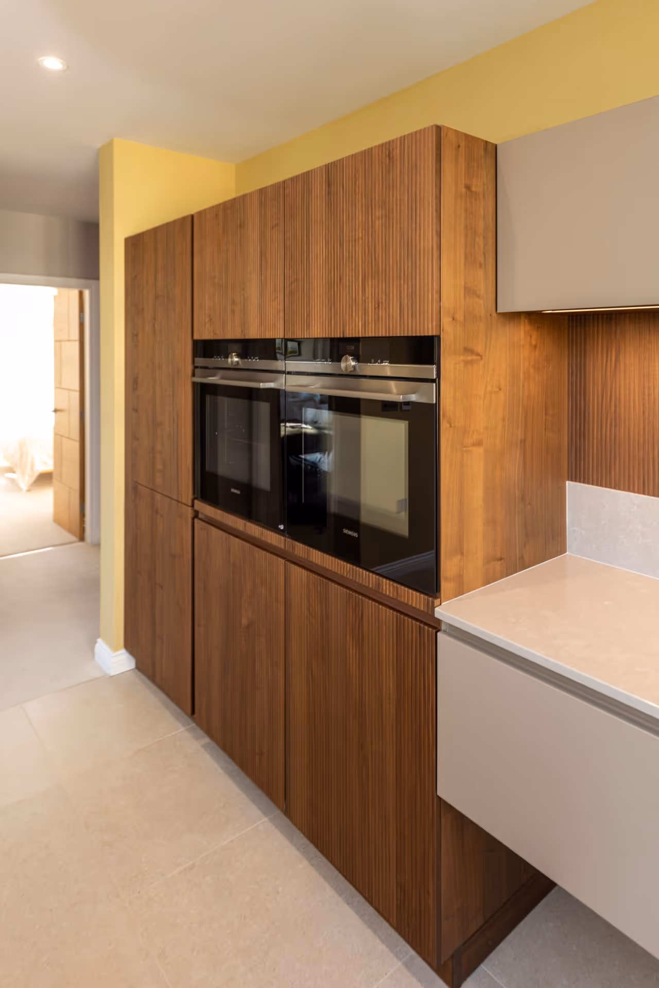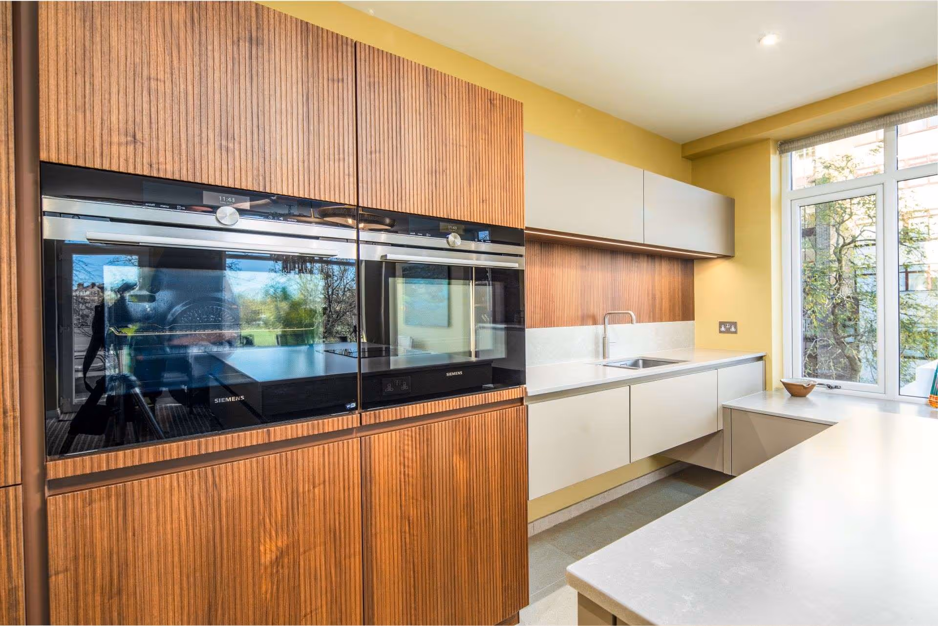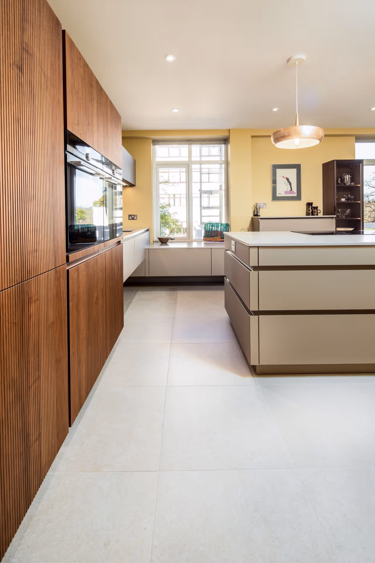 The kitchen features a Leicht Bossa Grooved Walnut Veneer finish, adding warmth and texture to the space. Siemens integrated appliances ensure a sleek and streamlined look, while a Quooker boiling water tap offers convenience and efficiency. Silestone worktops provide durability and a touch of elegance.