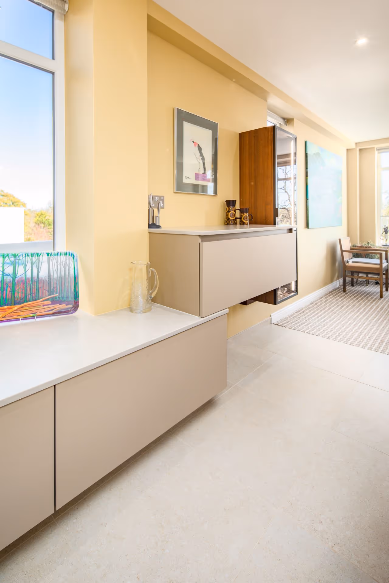 The kitchen boasts a bespoke floating sink, creating a focal point that is both modern and visually intriguing. The tiered worktop adds another layer of design interest while also providing distinct zones for food preparation and other kitchen activities.