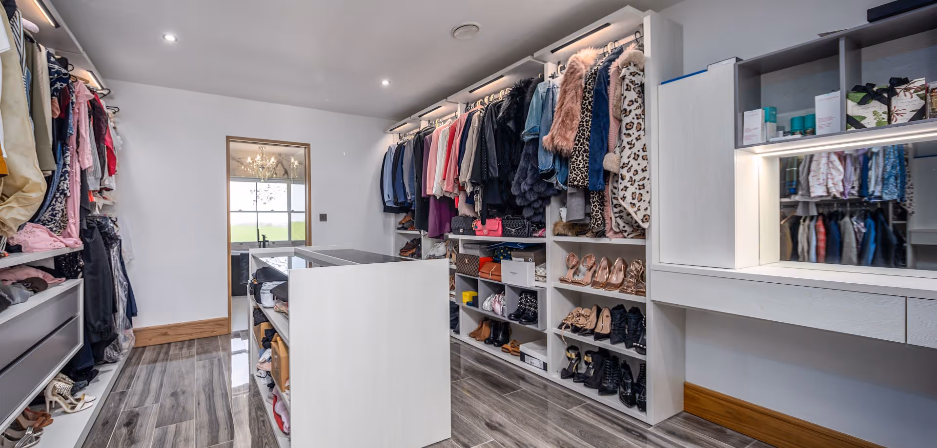 Andrew James Kitchens, Bedrooms & Bathrooms brought this vision to life with meticulous attention to detail and bespoke design solutions. The highlight of this bedroom suite is the walk-in dressing area, designed with open hanging to maximise both visibility and ease of access to clothing. This walk-through space also incorporates a bespoke built-in dressing table section, providing a dedicated area for makeup application.