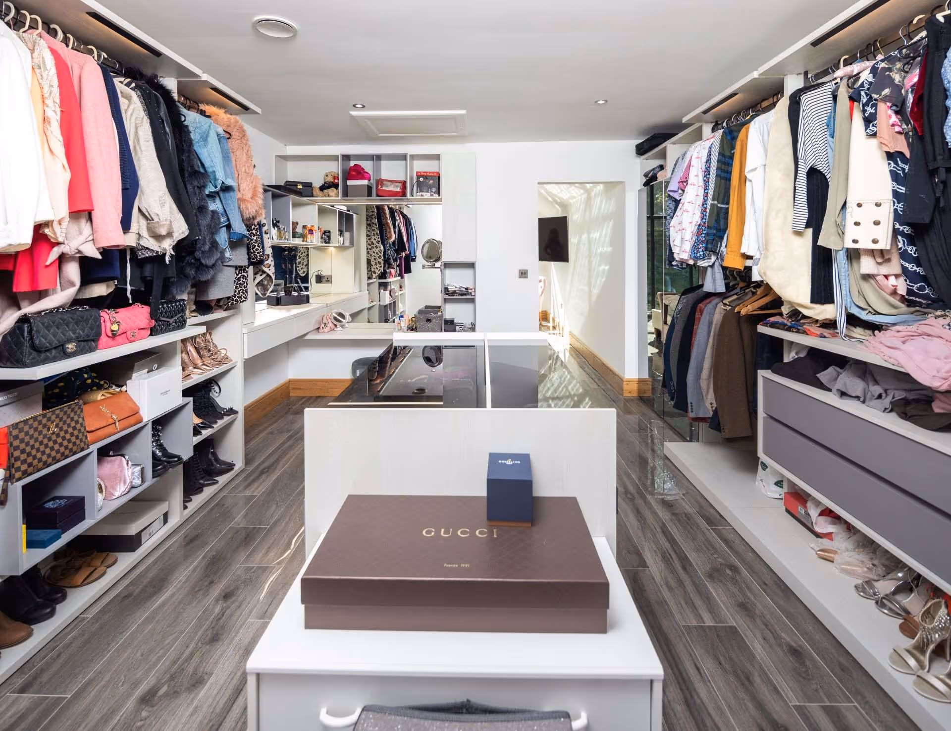 The design prioritises efficient use of space, ensuring that every item is easily accessible and well-organised.At the heart of the dressing room, an Aristotle island unit takes centre stage. This feature provides substantial additional storage and display space, while also adding a touch of elegance and sophistication, mirroring the design language established in the kitchen downstairs.
